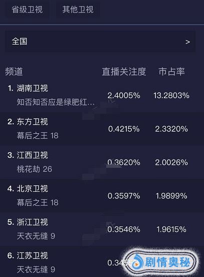 这是最新的电视剧收视率排行榜,可以看到实时收视率排在前五名的依次是《知否知否应是绿肥红瘦》、《幕后之王》(东方卫视)、《桃花劫》、《幕后之王》(北京卫视),以及《天衣无缝》,其中收视率破2.4的《知否知否》继续领跑,周冬雨与罗晋合作的新剧《幕后之王》居次席。