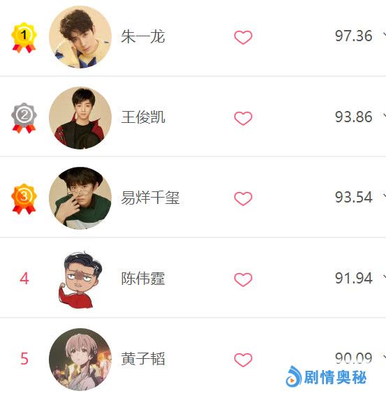 先看周榜前五名,在上周曝光度最高的五位娱乐圈明星依次是热度指数97.36的朱一龙、热度指数93.86的TFBOYS队长王俊凯、易烊千玺、陈伟霆,以及黄子韬,其中完美演绎《知否知否应是绿肥红瘦》元若哥哥的拢龙遥遥领先,承包榜单第二名和第三名的TFBOYS组合值得肯定,排在易烊千玺之后的陈伟霆黄子韬背靠背。
