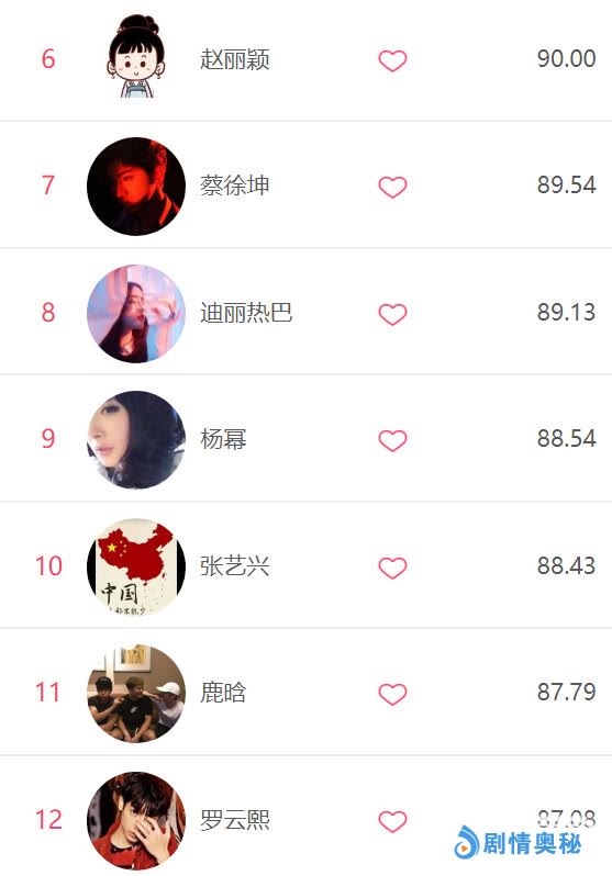 位列周榜第6~第12位的娱乐圈明星依次是赵丽颖、蔡徐坤、迪丽热巴、杨幂、张艺兴、鹿晗、罗云熙,娱乐圈明星在上周的流量大战已经谢幕,这一周才刚刚开始,你看好哪位明星在本周的发展?