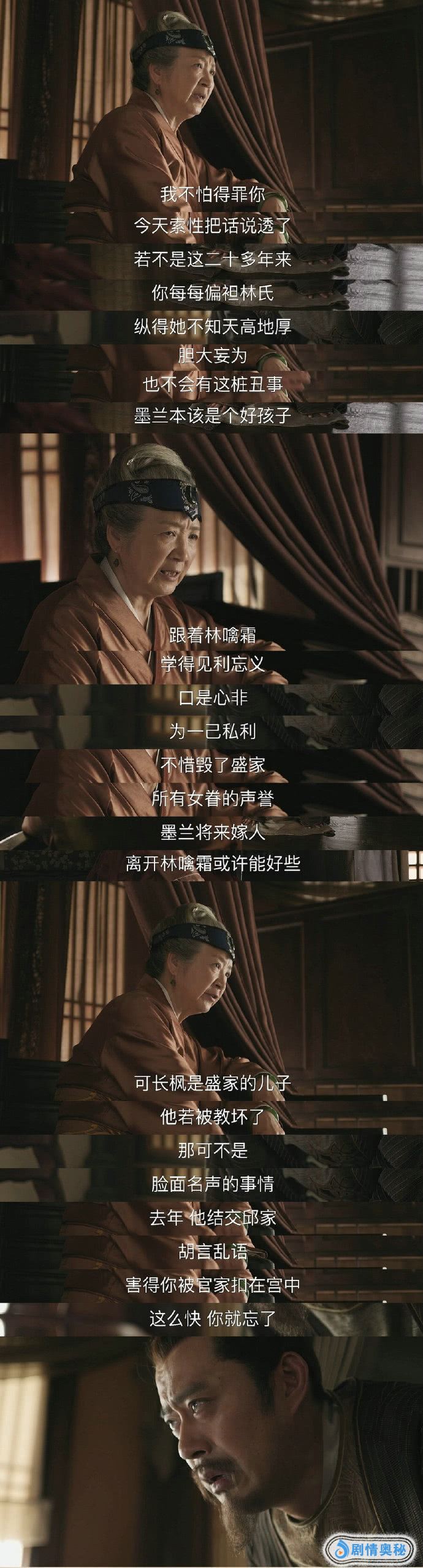 因为两人私会事件闹得街知巷闻,盛紘前去老太太面前请罪。老太太说了一席话,点醒了这些年袒护迷恋林噙霜的盛紘。