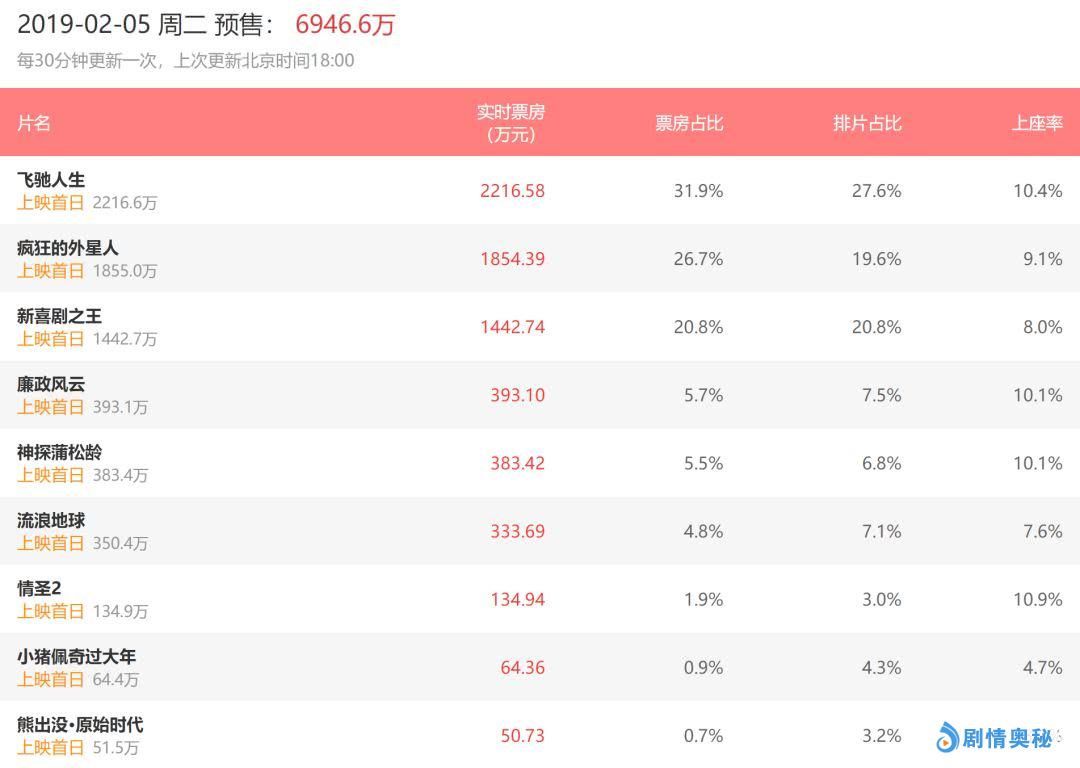 不过话说回来,今年的春节档,竞争确实比往年要激烈许多,看看目前排在《神探蒲松龄》前面的都是哪些电影?有韩寒导演,沈腾主演的《飞驰人生》,宁浩导演,黄渤、沈腾主演的《疯狂的外星人》,周星驰导演,王宝强主演的《新喜剧之王》,还有麦兆辉导演,刘青云、张家辉主演的《廉政风云》,感觉每一部都很强有木有?!