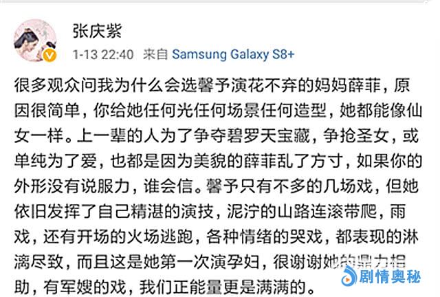 除了肯定张馨予的颜值外,制片人还夸赞了张馨予的演技,表示张馨予的戏份虽少,但她经历了雨戏、火戏、哭戏还有第一次表演孕妇,大赞她演技精湛,各种场景的戏都表现的淋漓尽致。