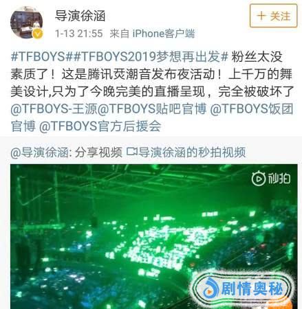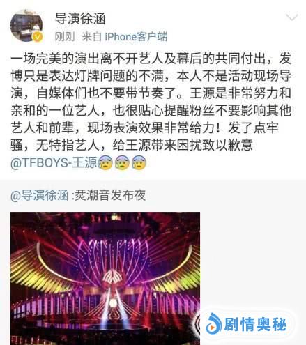 随后,这位导演有紧急发博道歉,称:“一场完美的演出离不开艺人及幕后的共同付出,发博只是表达灯牌问题的不满,本人不是活动现场导演,自媒体们也不要带节奏了。”