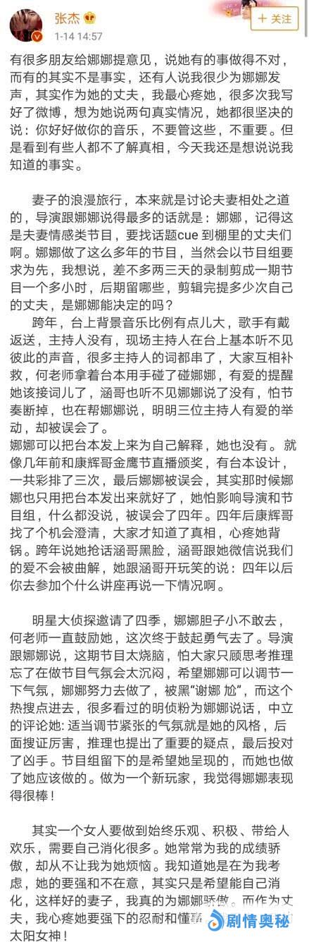 对于近日谢娜频繁上热搜,被黑的事儿,1月14日,丈夫张杰也在微博发长文做出回应,他表示:“有人说我很少为娜娜发声,其实作为她的丈夫,我最心疼她,很多次我写好了微博,想为她说两句真实情况,她都很坚决的说:你好好做你的音乐,不要管这些,不重要。但是看到有些人都不了解真相,今天我还是想说说我知道的事实。”