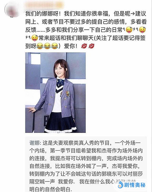 谢娜回复了其中一位粉丝的建议,从粉丝发表的帖子来看,言语中对谢娜都是小心爱护,很温柔不是强势提建议的那种,粉丝希望谢娜在节目中、网上不要过多的提及自己的感情,要多多分享自己的日常。简单的两句话引来了谢娜的关注,谢娜回复粉丝称《妻子的浪漫旅行》是一档夫妻共同体节目,是节目组希望自己和张杰完成棚内棚外的转换,同时也表示自己在做什么心里很清楚,明白的自然会明白。