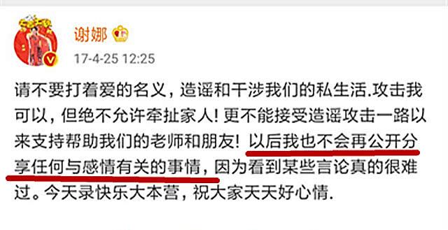 2017年谢娜曾在微博表态,表示自己再也不会公开分享有关感情的任何事情,不过谢娜并没有坚持多久,尤其在公布怀孕之后,就开始频繁的提及张杰,公开为张杰打call等。