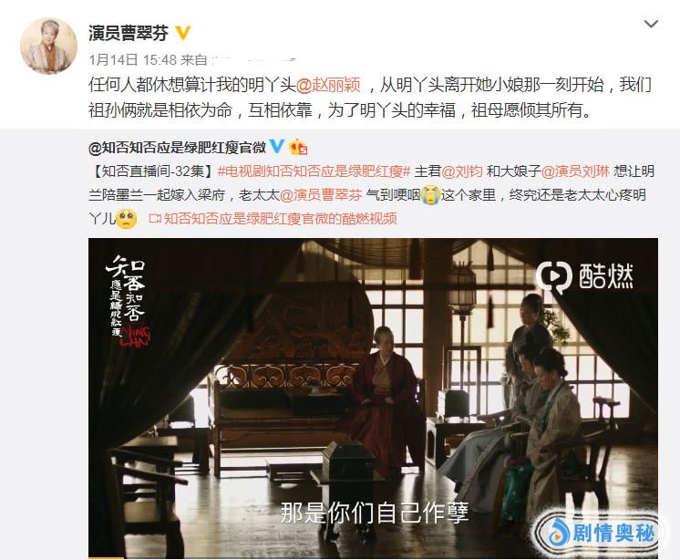 除了出现在高露的微博评论区之外,剧中扮演“老太太”的演员曹翠芬也更新了动态,表示谁也别想算计我的“明丫头”,并且还艾特了赵丽颖,而赵丽颖也是等到了三更半夜才活跃起来,回复了老戏骨的微博,不料就是这样的举动把粉丝给“惹急”了。