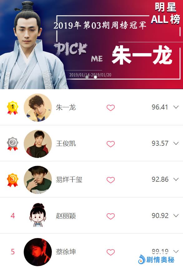 优质明星热度周榜更新,朱一龙夺周榜冠军,赵丽颖收获本月最佳排名
