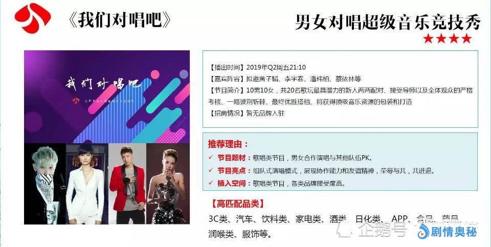 这种节目的形式还是比较新颖的,目前在电视荧屏上比较少见。而这档新综艺《我们对唱吧》邀请到的四位导师阵容,也都是观众们认可的实力歌手,像黄子韬、李宇春、蔡依林、潘玮柏几位会加盟,节目暂定2019年第二季度周五21点开播。